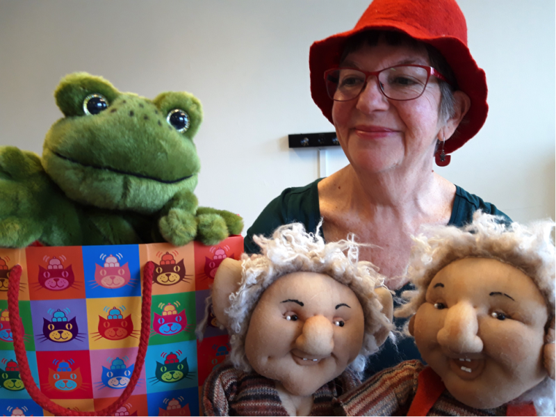 Mette Hansen fortæller eventyr for børn med dukker og rekvisitter.