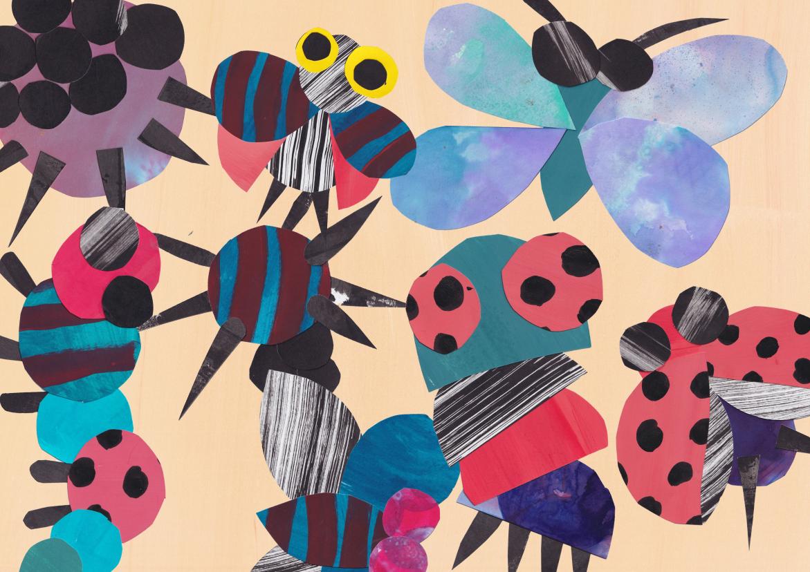 Workshoppen indledes med højtlæsning fra børnebogen "Kari Kakerlak – Vågn op, brormand!", hvor børnene inddrages aktivt med lyde og små bevægelser undervejs. Herefter arbejder børn og voksne sammen med papir, lim og farverige mønstre og skaber deres egne insektcollager i et roligt og trygt tempo.